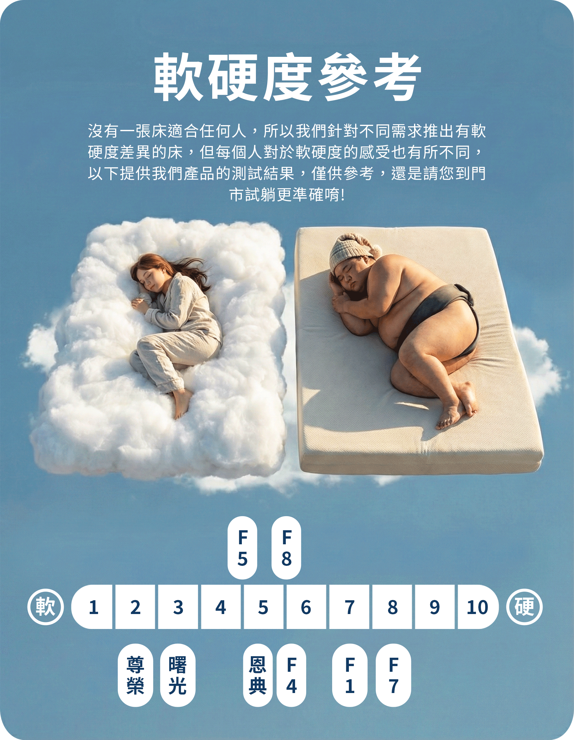 您可以當作來這睡一覺,我們的種類不會太多,所以你只要試躺幾張,就能輕易找到適合你的床。
