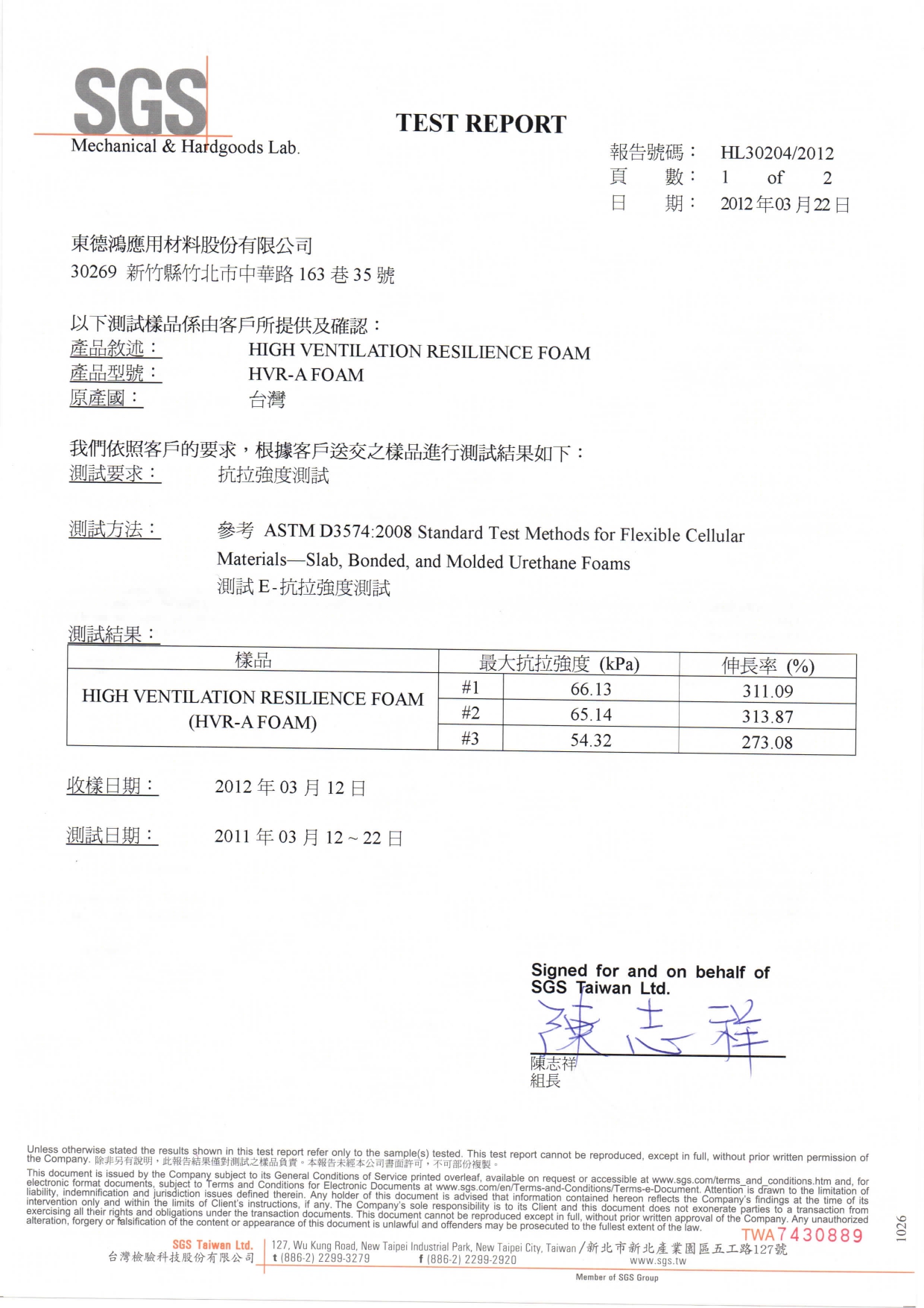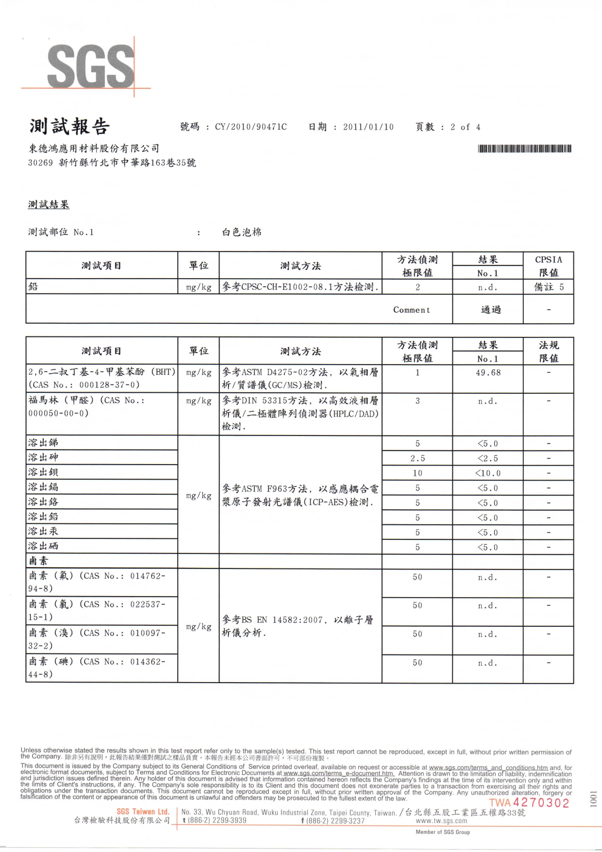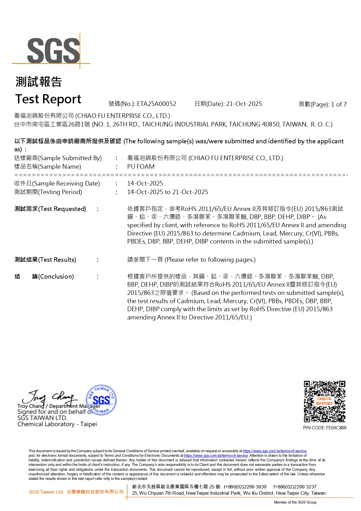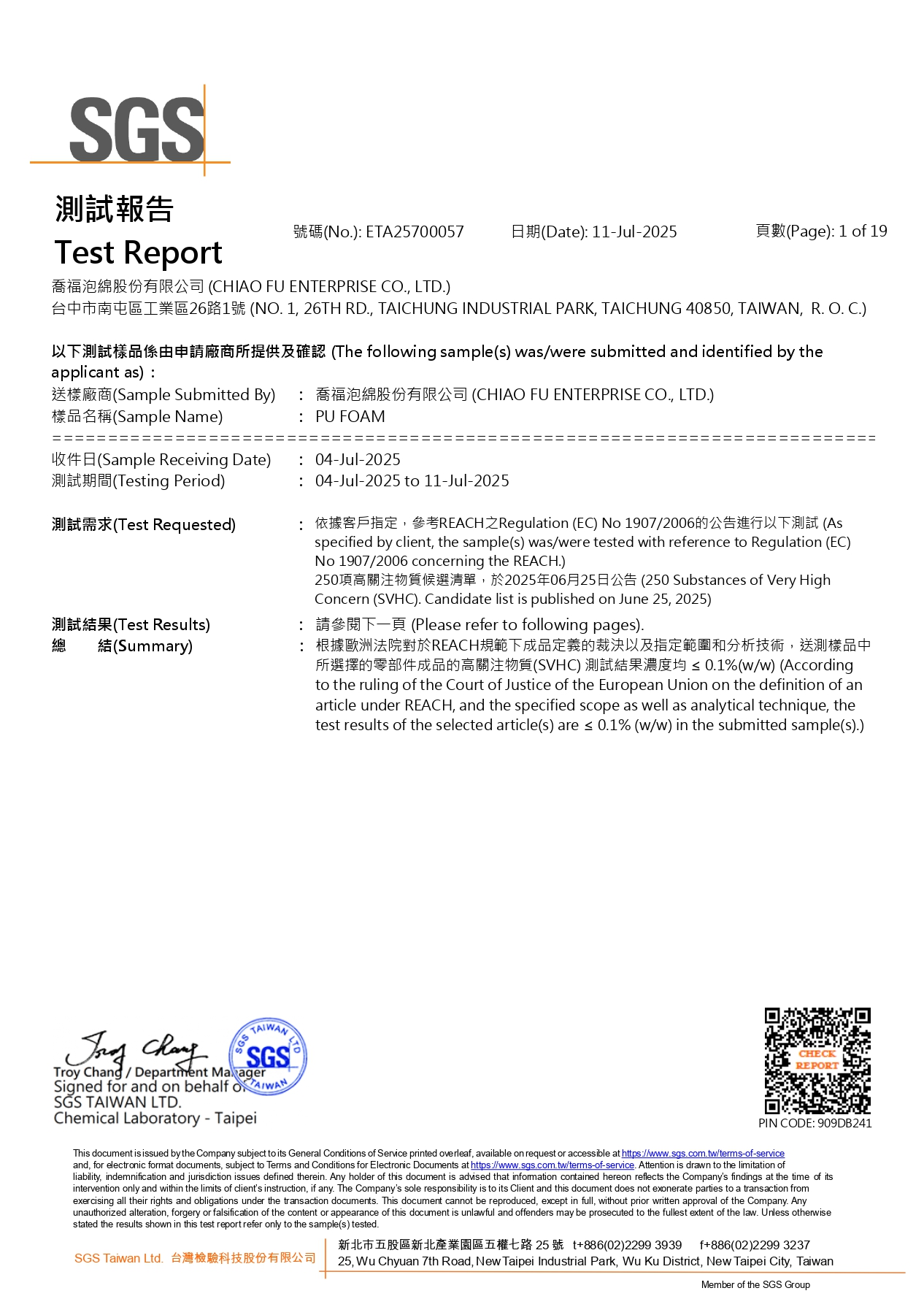 包含 2025 年最新喬福泡綿 REACH 250 項 與 RoHS 十大重金屬無毒認證 ,以及車花層專用白色泡棉之 240 項檢測。
