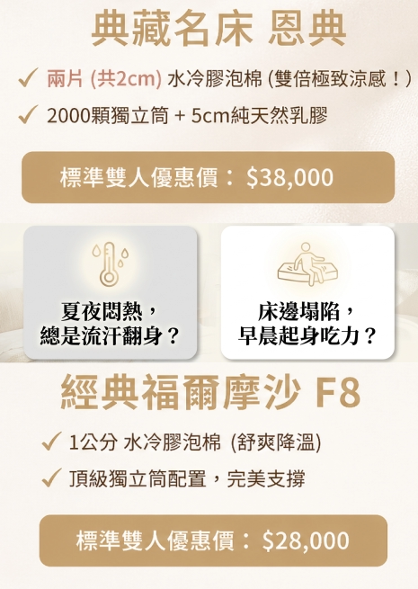 今年母親節,別再讓她將就了。 媽媽總是為了省電費捨不得吹冷氣嗎?我們的指定主打款 【F8】 與 【恩典】 床墊,特別採用頂級「水冷膠涼感泡棉」,能有效調節睡眠溫度、快速散熱透氣。讓媽媽在炎熱夏夜,不用狂吹冷氣也能享受清爽降溫的一夜好眠。 更重要的是,床墊擁有 SGS 耐久性測試報告書的品質認證,就像媽媽的愛一樣穩固長久。